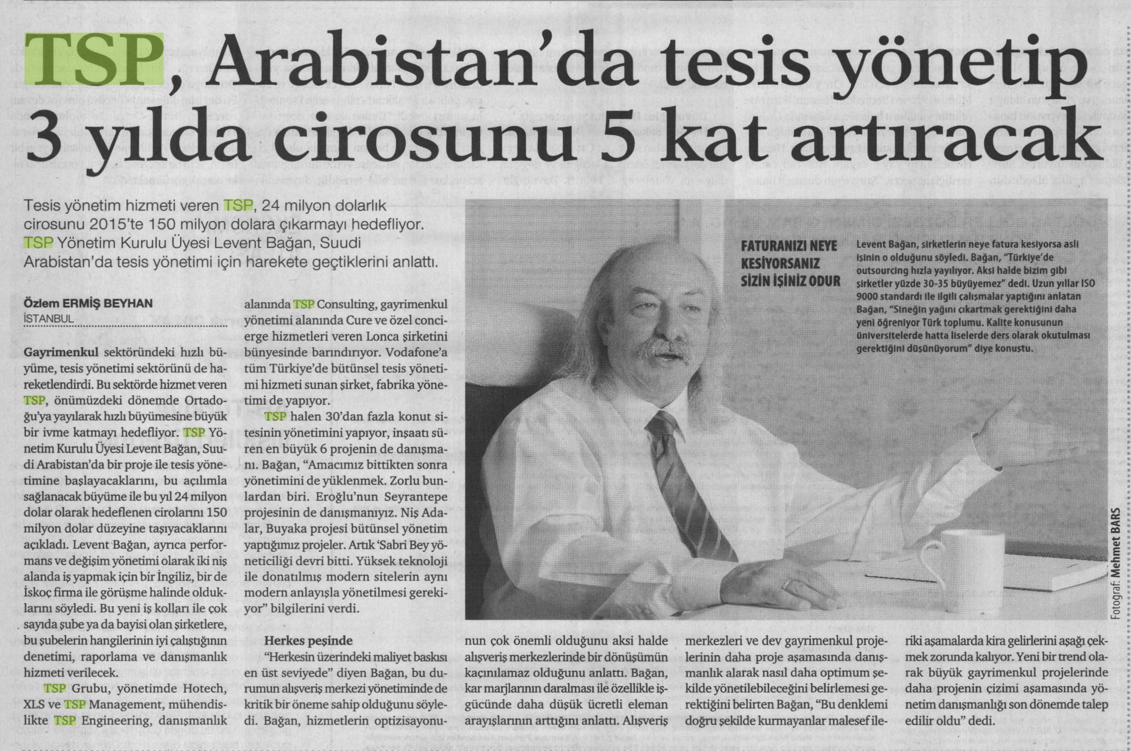 Tesis Yönetimi hizmeti veren TSP, 24 milyon dolarlık cirosunu 2015’te 150 milyon dolara çıkarmayı hedefliyor. TSP Yönetim Kurulu Üyesi Levent Bağan, Suudi Arabistan’da tesis yönetimi için harekete geçtiklerini anlattı.