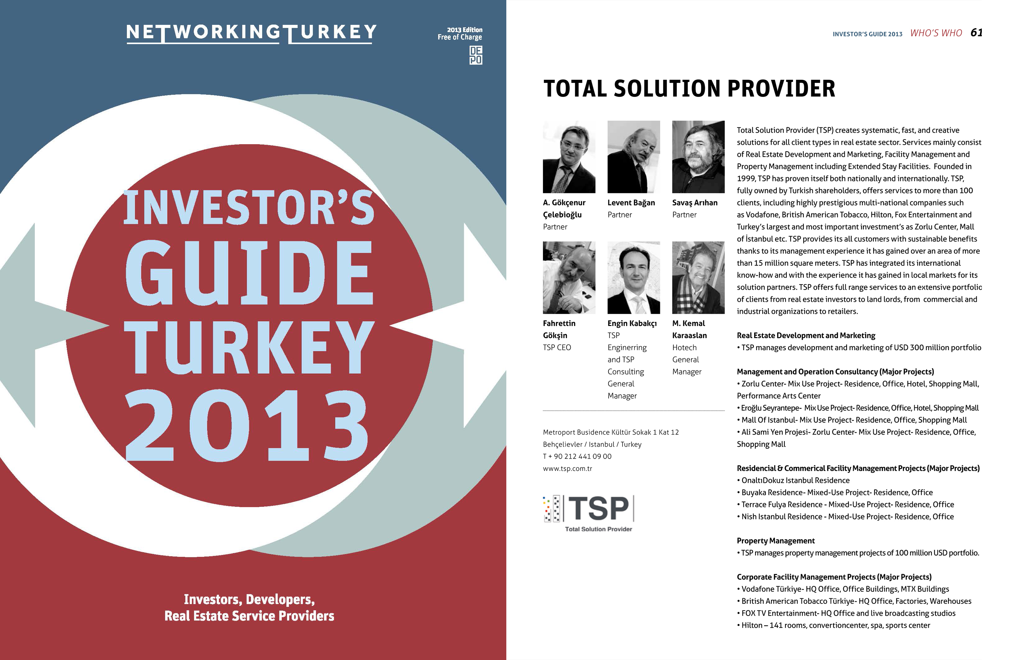 TSP Uluslarası MIPIM Fuarında, Türkiyenin tanıtıldığı Investors Guide Turkey 2013 kitabında yer alan tek Facility Management Firması idi.
